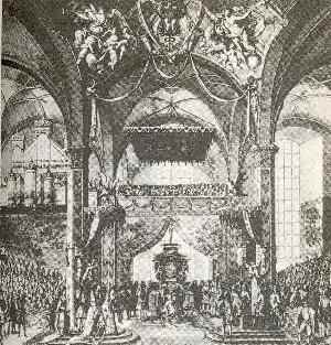 1701 - 1797Vom Herzogtum zum KönigreichVon Preußen als gesamtstaatliche Begrifflichkeit spricht man ab dem Jahr 1701. Am 18.01.1701 krönte sich Friedrich I. im Audienzsaal des Königsberger Schlosses selbst zum König in Preußen.